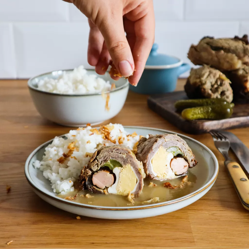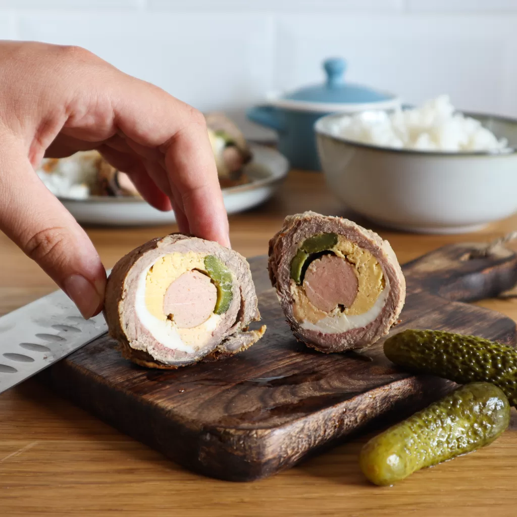 Plátky masa naklepejte, osolte a opepřete ze všech stran. Z jedné strany maso potřete plnotučnou hořčicí a na plátek masa položte kyselou okurku, párek a půlku vajíčka. Plátek masa srolujte a za pomocí nitě nebo párátka maso zajistěte, aby náplň nevypadla.