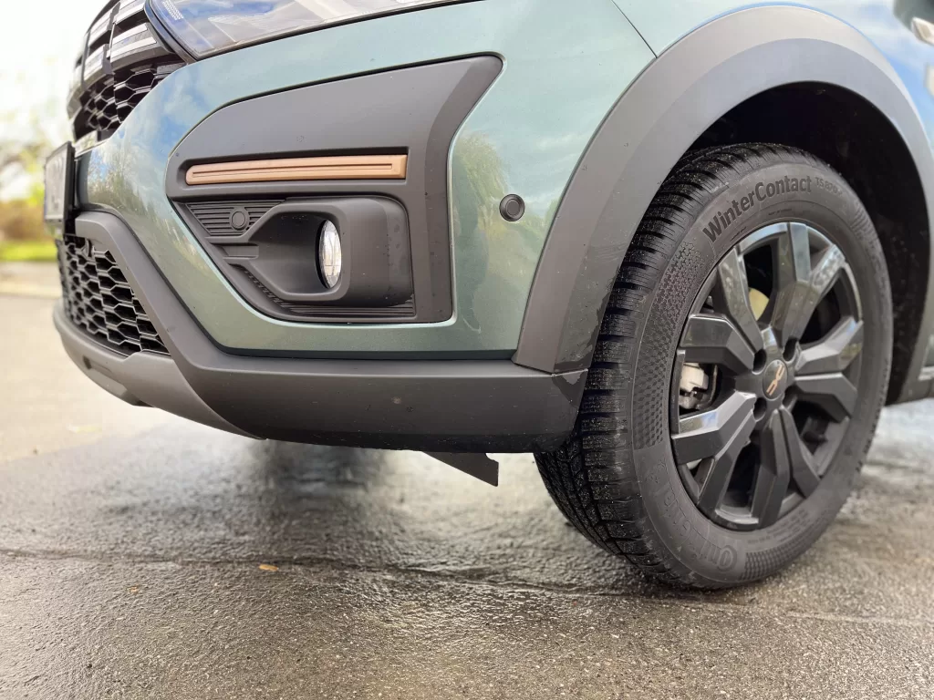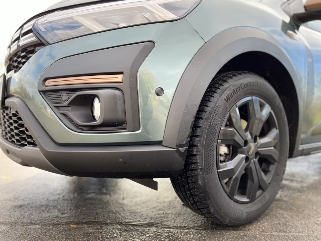 Nedávná změna identity se na první pohled týkala jen nového loga. Přední masku dnes nahradila hranatá písmena DC bílé barvy, identita se objevuje i na volantu nebo pátých dveřích. Když se na tento zelený klenot podíváte zblízka, ty měděné detaily jsou na náš vkus decentní a v kombinaci s metalízou Cèdre zkrátka sluší. Výraznější jsou rovněž polepy s linkami připomínajícími vrstevnice, a samozřejmě nová loga. Sandero Stepway charakterizuje klenutější kapota, nové a výrazné nárazníky vpředu i vzadu s ochrannými prvky v matném chromu.