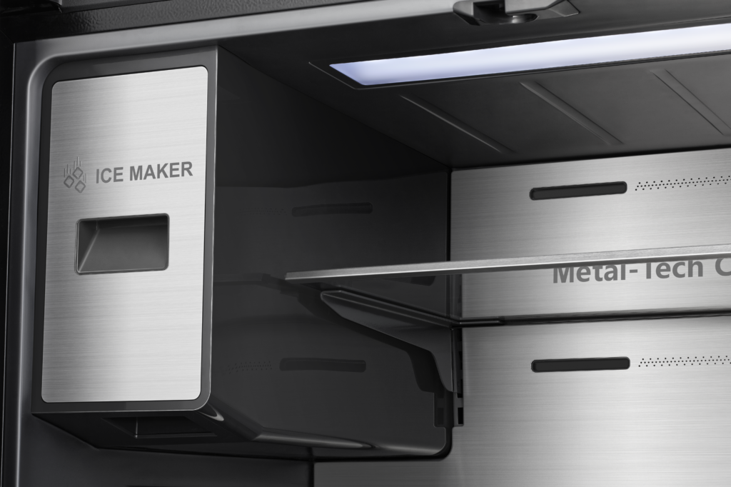 Na vnější straně dvířek vlevo je integrovaný dávkovač chladné čerstvé vody, ledu a ledové tříště s připojením na vodovod. Dokáže vyrobit až 2,2 kg ledových kostek za půl dne, takže zásoba nedojde, ani když budete mít spoustu hostů.