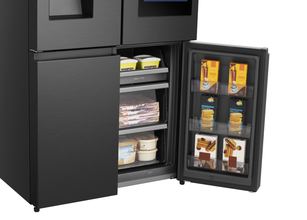 Hisense RQ760N4IFE má šířku 90 cm, velkorysou kapacitu téměř 600 l a velmi praktické čtyřdveřové uspořádání. Když dostanete na něco chuť, stačí otevřít mnohem menší prostor, než u klasické dvoudveřové „ameriky“. Tepelná výměna mezi místností a vnitřním prostředím chladničky je menší, potraviny netrpí a následné obnovení optimální teploty je ekonomičtější.