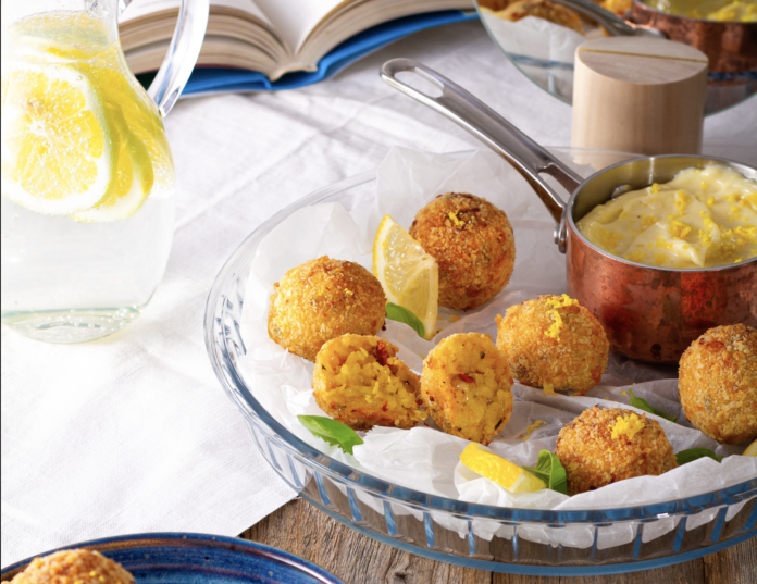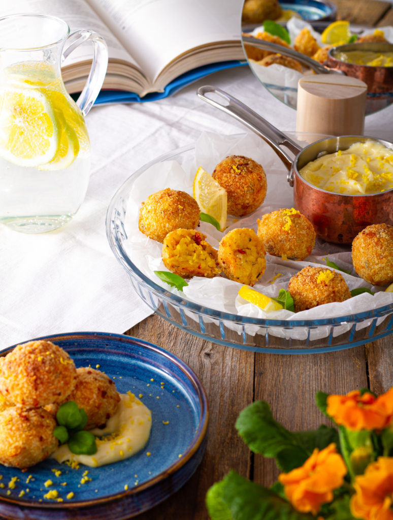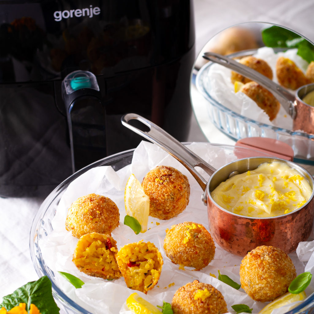 Postup: Na másle zpěníme najemno nasekanou šalotku a česnek. Přidáme rýži, kterou smažíme 2-3 minuty. Takto orestovanou rýži zalijeme bílým vínem, které necháme zredukovat. V tomto bodě základ na arancini opepříme. Přidáme šafrán, který jsme namočili do 1 dl teplé vody a podlijeme troškou vývaru. Důležité je neustále míchat, protože pokud má málo tekutiny, zvykne se připalovat. Vždy, když se nám zdá, že je rizoto velmi husté, přidáme po malých množstvích vývar. Zde platí staré známé pravidlo, že přidat můžeme vždy, ale odebrat už málokdy. and V polovině přidávání vývaru přidáme na malé kostičky nasekané sušená rajčata. Vývar přestaneme přidávat ve chvíli, kdy je rýže al dente, přesně jako při těstovinách – čili ani velmi měkká, ani velmi tvrdá. Jakmile se vám rýže zamlouvá a má konzistenci řídké ovesné kaše, přidáte parmazán, který to celé krásně zahustí a dodá ještě krémovější konzistenci a chuť. Na závěr ještě do rýže přidáme hrst nasekané čerstvé bazalky. Takto připravenou rýži necháme zcela vychladnout. Mozzarellu nakrájíme na malé kostičky. Z rýže vytvarujeme kuličky o průměru asi 3 cm, do jejichž středu zapracujeme během tvarování kostičku mozzarellu. Kuličky obalíme v klasickém trojobalu – mouka, vajíčko a strouhanka. Horkovzdušnou fritézu Gorenje nastavíme na 200 stupňů a na čas 12 minut. Tak budou arancini uvnitř krásně hebké a na povrchu super křupavé. and Majonézu připravíme tak, že metličkou smícháme dvě žloutku a hořčici v misce a do této směsi velmi opatrně a pomalu přiléváme olej. Na začátek opravdu jen po kapkách. Po 1/2 oleje přidáme vinný ocet. Když se olej celý pěkně spojí, přidáme citrónovou šťávu, kůru osolíme a opepříme.