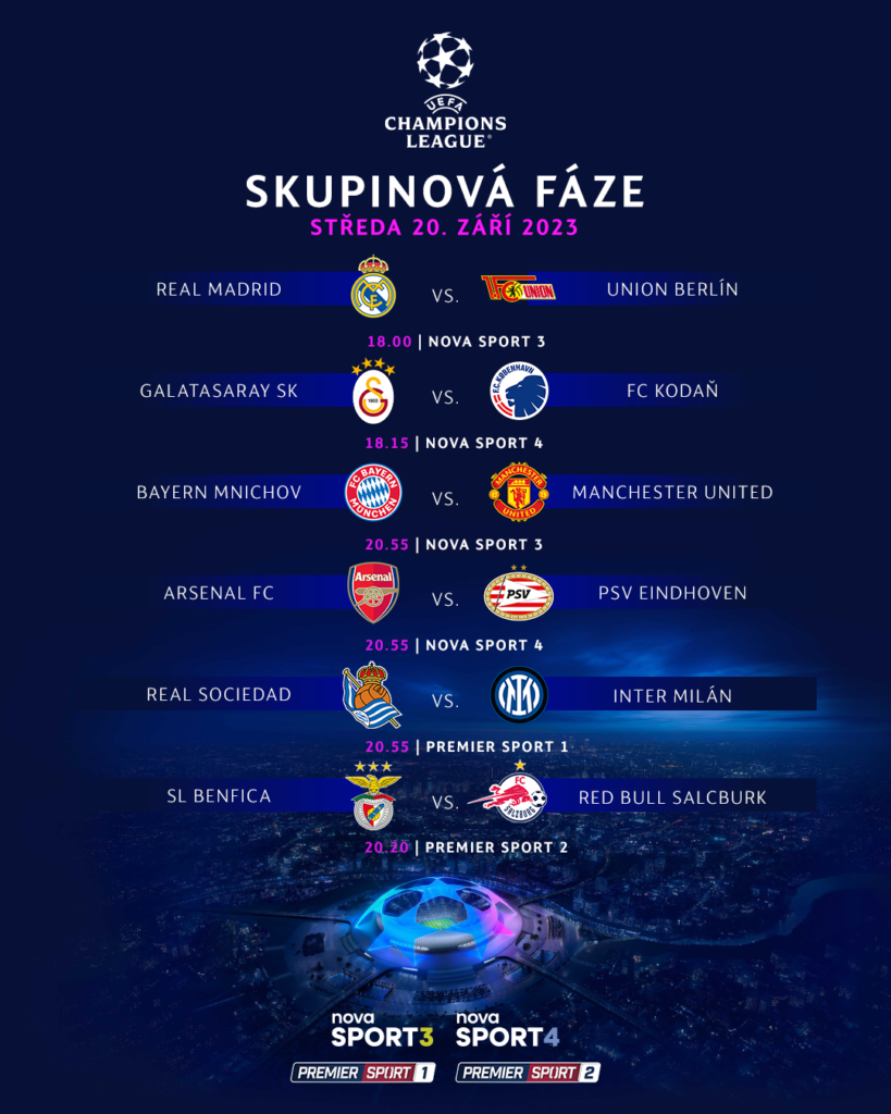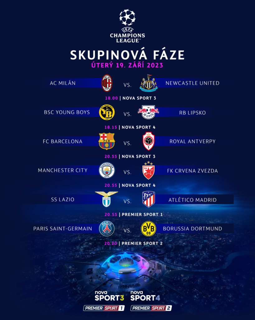 V úterý 19. září sledujte na kanálu Nova Sport 3 duel AC Milán – Newcastle United (od 18:00 hod), na který navazuje zápas FC Barcelona – Royal Antverpy. Stanice Nova Sport 4 pak vysílá zápasy BSC Young Boys – RB Lipsko a večerní Manchester City – Crvena Zveda. Na kanálu Premier Sport 2 začíná ve 20:20 hodin atraktivní utkání PSG – Borussia Dortmund.