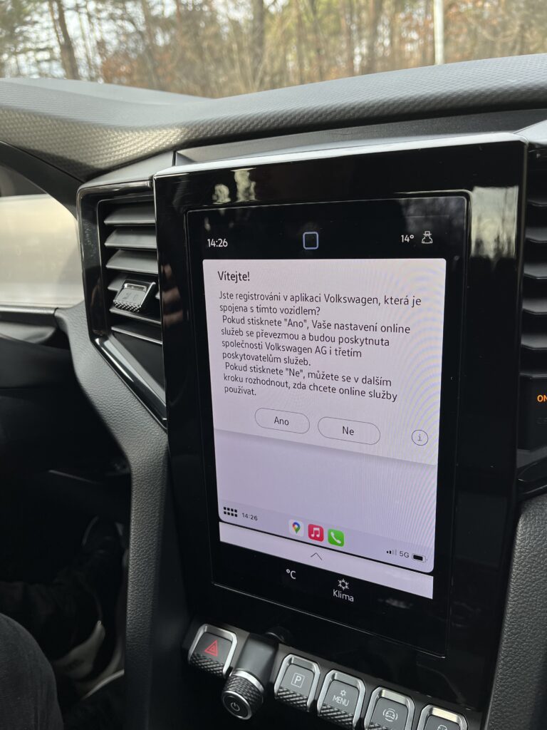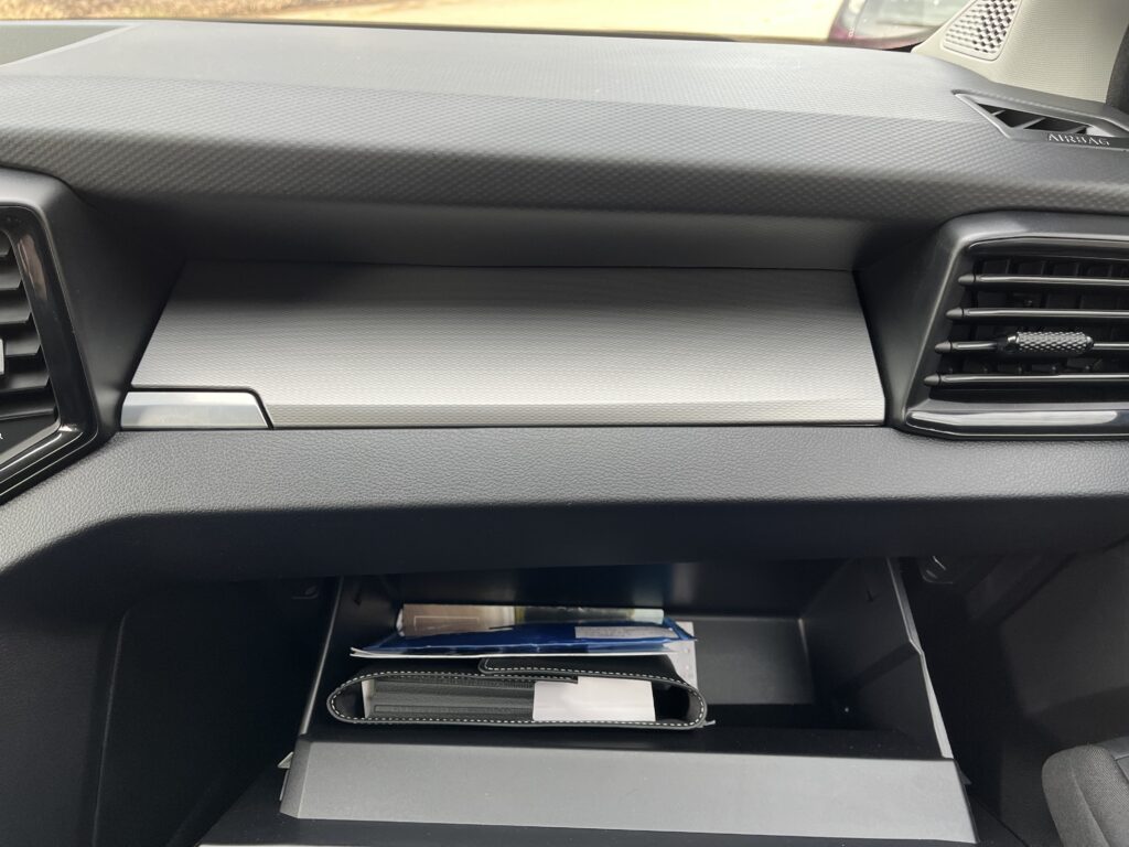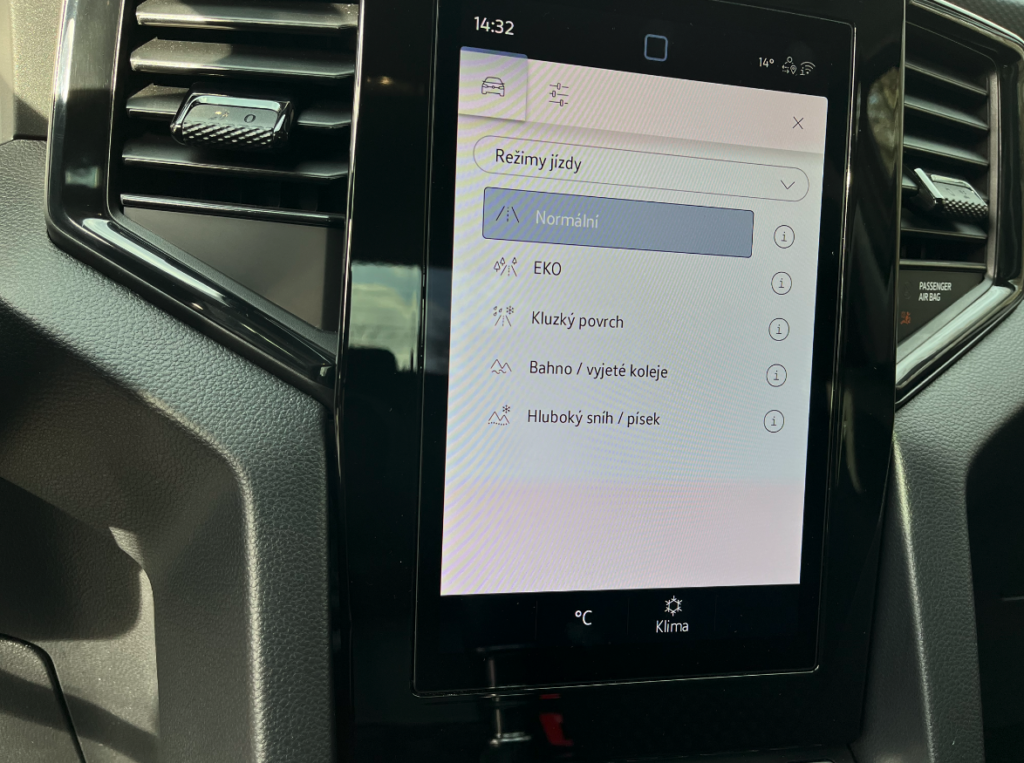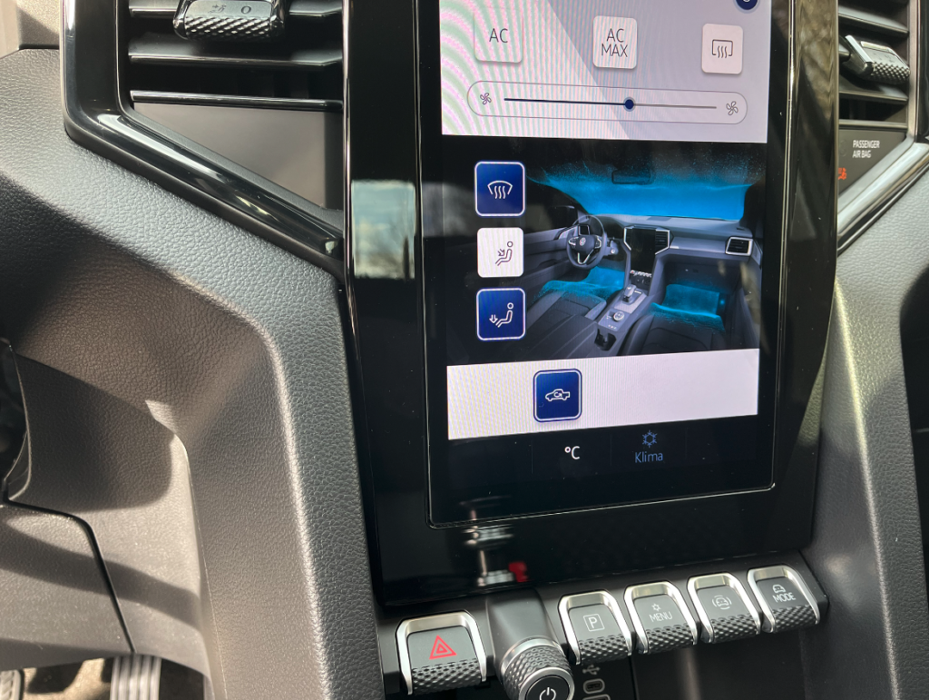 Potěší vás dostatek úložných prostor před spolujezdcem, kde se nachází dvě palubní přihrádky nad sebou. Na displeji ovládáte takové běžné věci jako třeba klimatizace a Android auto i Apple Car. Hned pod displejem a tlačítky objevíte klasickou zásuvku pro auto nabíječku a možnost si kabelově připojit telefon. Středový panel zobrazuje volič automatické desetistupňové převodovky, možnost jízdních režimů, elektronickou ruční brzdu a držáky na nápoje.
