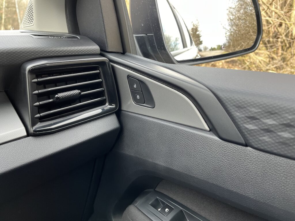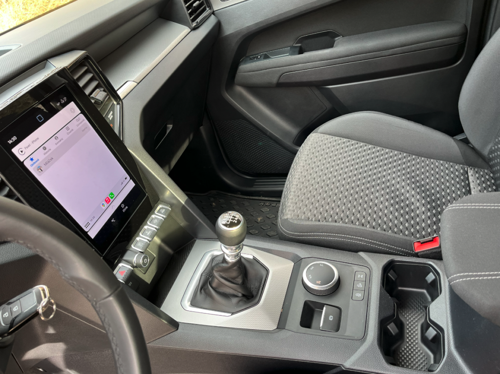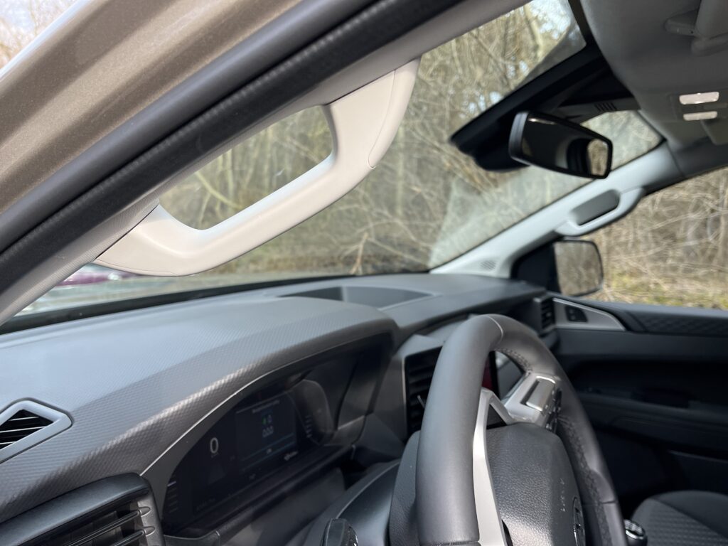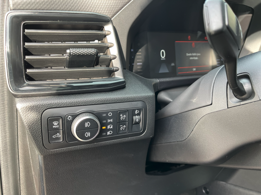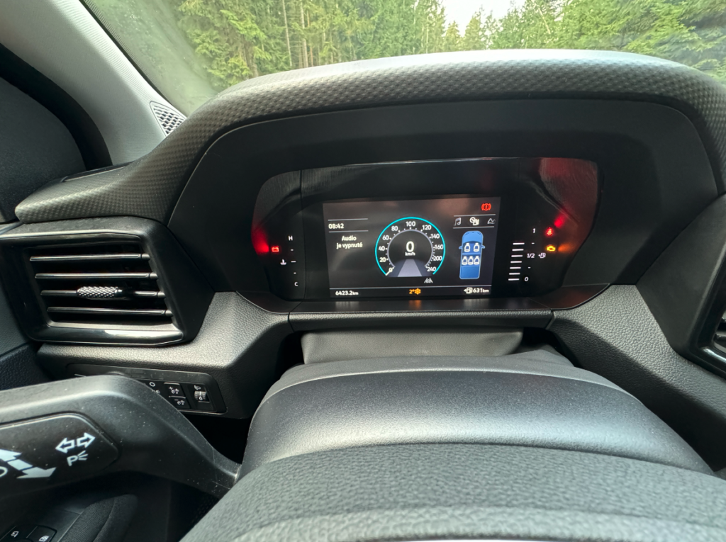 Po usednutí do sedadel se před vámi otevírá digitální přístrojový štít. Ten má velikost osm palců a je různě nastavitelný dle vašich aktuálních preferencí. Na levé straně za volantem najdeme ovládání světel. Mezi řidičem a spolujezdcem je dominantou velký výškový dotykový displej pod kterým jsou zkratky, které lze dobře ovládat i v pracovních rukavicích, což ještě podporuje užitkový naturel vozu.